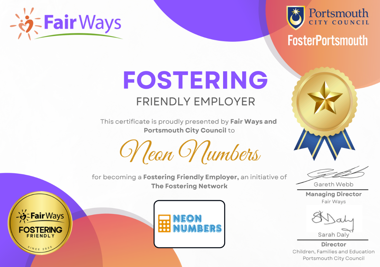 Neon Numbers has become a Fostering Friendly Employer! We've joined the Fair Ways Fostering Friendly Employer Initiative to demonstrate our support for any employees considering fostering.